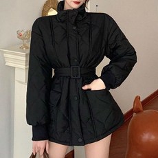 겨울 여성패딩 블랙 컬러 허리 벨트 장식 긴 소매 세련된 스타일의 퀼팅 패딩 점퍼 패딩코트