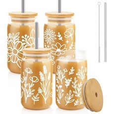 대나무 뚜껑 빨대가 달린 귀여운 유리컵 디자인이 적용된 16온스 음료잔 4팩 야생화 캔 모양 컵 에스테틱 아이스 커피잔 클리어 유리 텀블러 스무디 비어 소다 차를 위한 바소스, Wild Flower