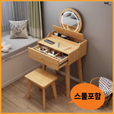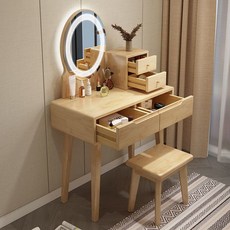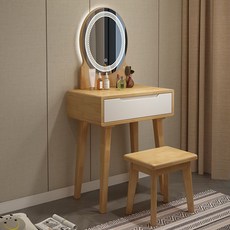 leii 미니 원목 화장대 거울 LED 조립식 서랍장 파우더룸 스툴, 내추럴원목
